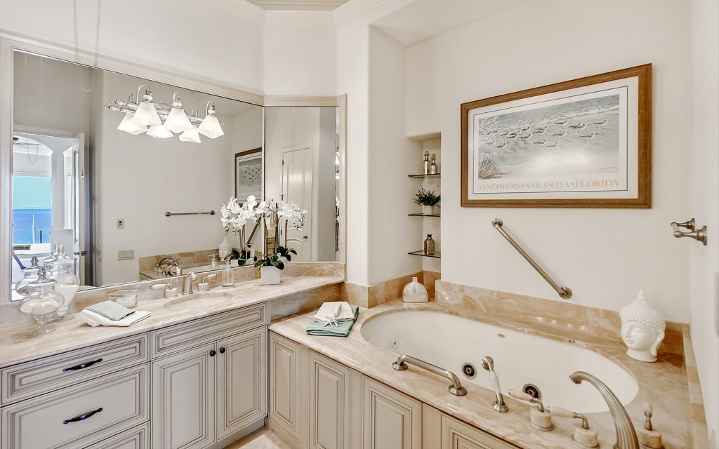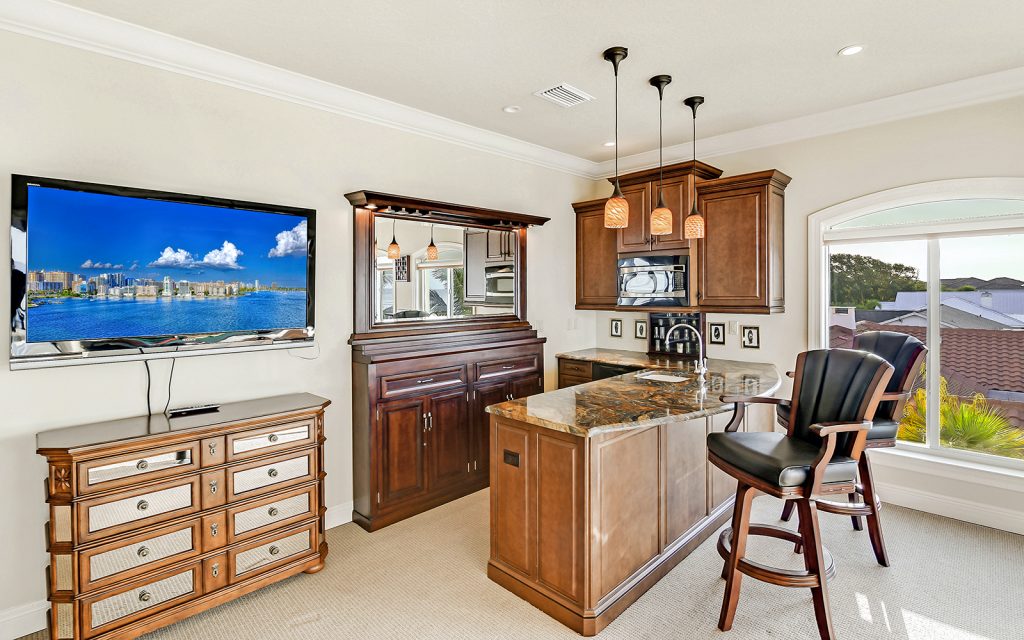 The living room extends upward to a 2-story octagonal tray ceiling and delights with an impressive water view. The high-end kitchen features Thermador Professional cooking appliances, eat-in island and solid-wood cabinetry with granite countertops. The spacious master retreat and ensuite bath on the first floor are perfect for pampering the restful side of life. Two guest suites on the first floor and two bedrooms that share a bath on the second floor complete the sleeping quarters.